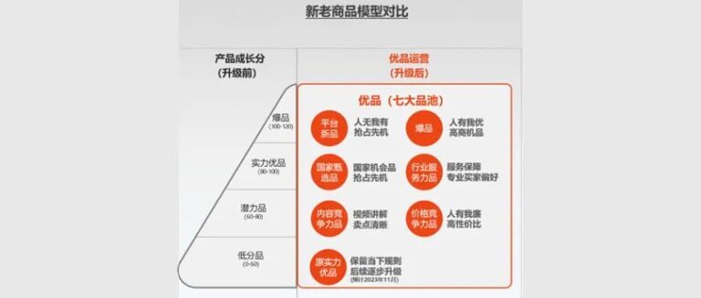 单一的分数制成长路径升级为多路径成为优品,在平台新品池、原实力优品池、爆品池的基础上,新增了国家甄选品池、行业服务礼品池、内容竞争力品池、价格竞争力品池,只要满足上述7个品池中的任意一个要求,即为优品。