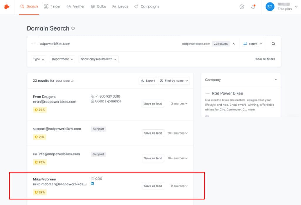 Radpower是美国比较大的电动自行车进口商,他们的官网是www.radpowerbikes.com. 我们想要知道这个域名下面的联系人的邮箱就可以用search这个功能,从搜索结果挑选出你想要的联系人。