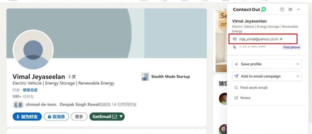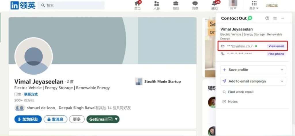 注册成功后就可以使用Contactout。按照最新的规则,免费账户有40个邮箱信用点,3个电话信用点。它可以作为谷歌浏览器的插件来使用。当我们在领英上找到目标客户时,一般会点击加为好友,但客户不一定会同意或者立即同意。那我们就没办法直接看到客户的电话和邮箱。这个时候我们用contactout,可以直接点开客户的邮件和电话。