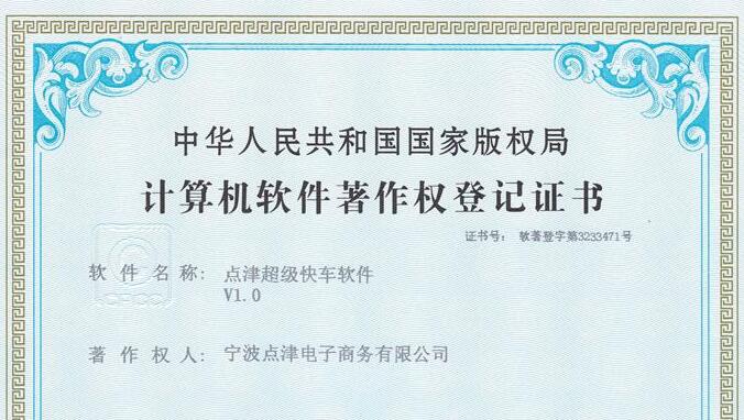2018年11月13日,点津(宁波)网络技术有限公司自行研发的阿里巴巴国际站外贸直通车P4P软件《点津超级快车V1.0》获得国家版权局计算机软件著作权登记证书。软著登字第3233471号。