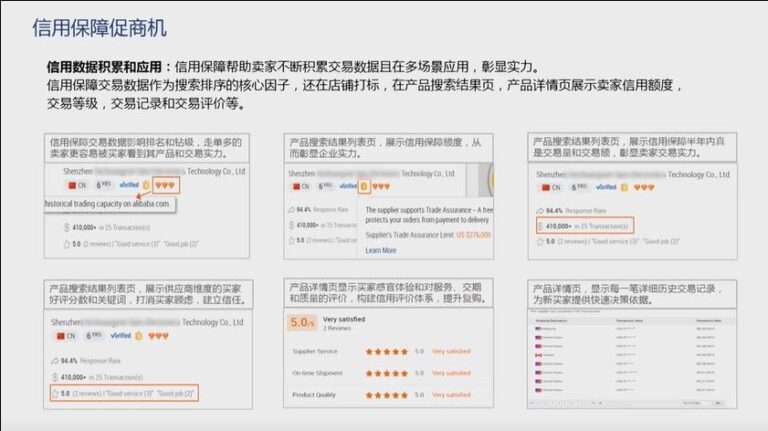 让买家的选择有更多依据。买家会依据卖家有没有阿里背书、基于信用保障交易额的钻级等级、还会看其他买家的评论数量等,点进评论页面左下方Transaction History页面,可以看到所有买家的交易记录,会清楚的知道如果下单,货物在自己的国家是否能顺利通关?是不是受欢迎的畅销品等重要信息。